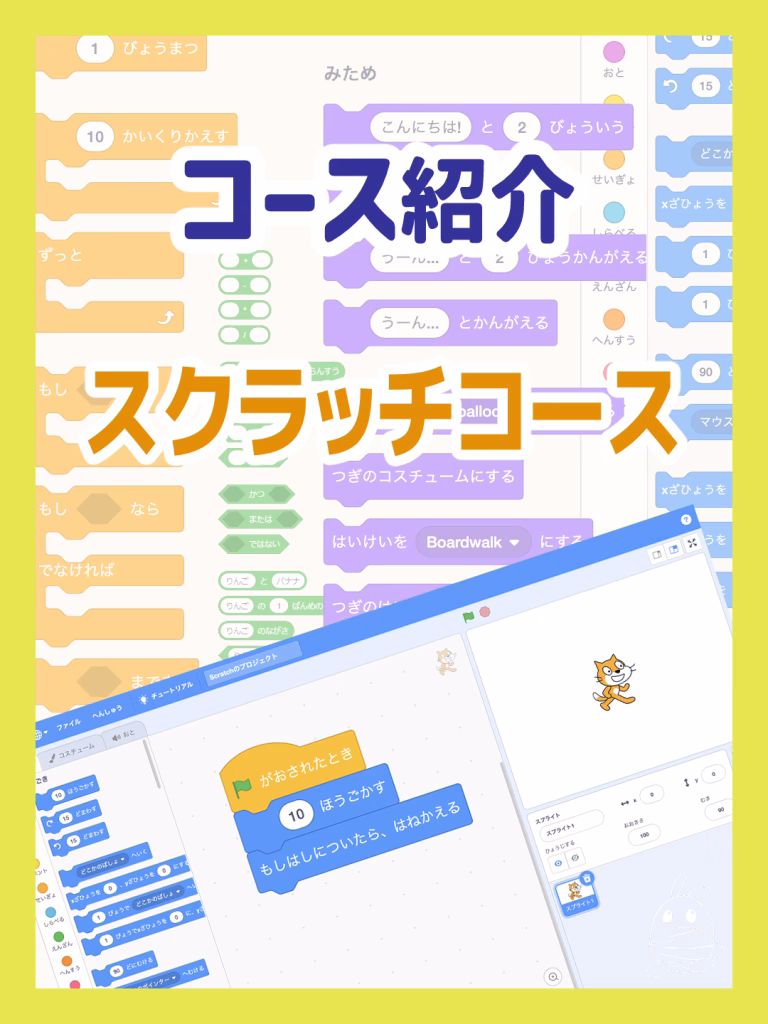 Scrach(スクラッチ)は、コードブロックをマウス操作で組合わせることでプログラムを作ることができ、キーボード入力に不慣れなお子様でも、プログラミングの考え方を基礎から学ぶことができます。